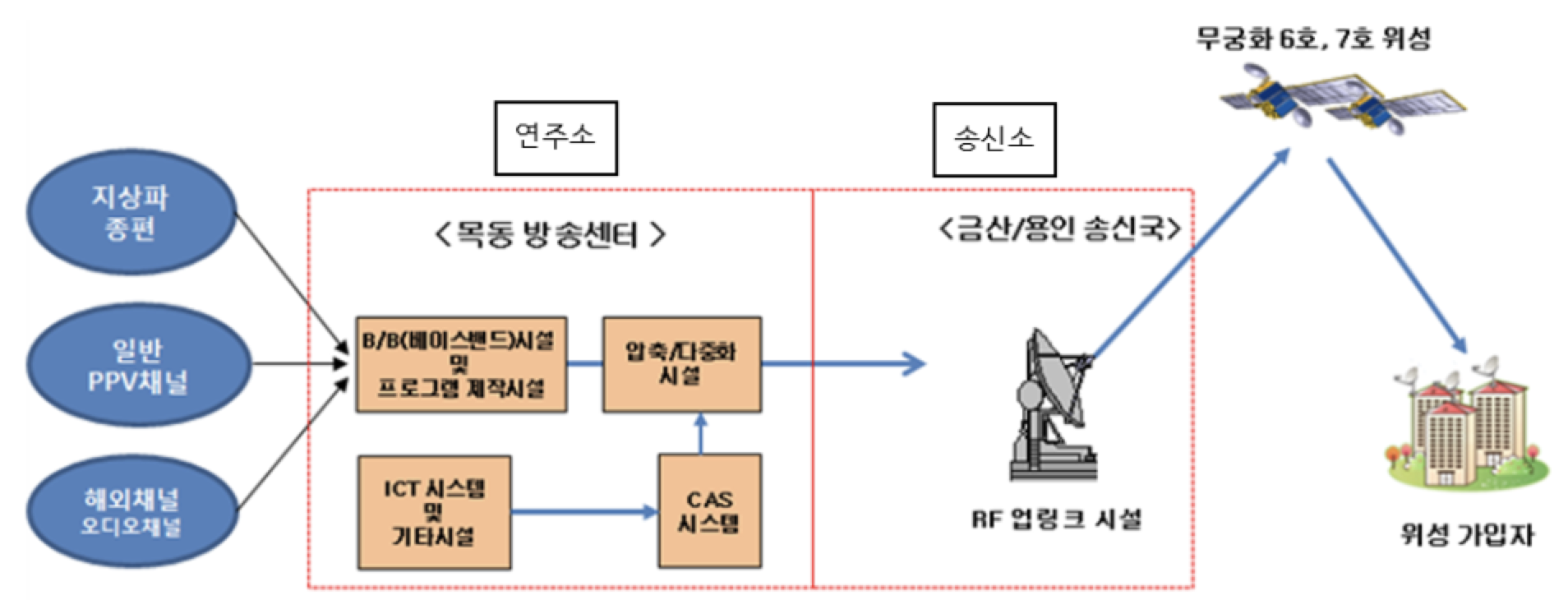 방송채널사용사업자(PP)로부터 방송 신호를 받고 통신국사에 설치된 대형 위성 안테나에서 방송 신호를 수신, 시청자 가구 내선단자까지 연결된 인터넷 망을 통해 방송을 제공한다. DCS는 위성방송 서비스의 한계 극복을 위해 개발됐다. 위성방송 신호는 한반도 전역에 전달된다는 광역성이 강점이다. 그러나 태풍·폭우·폭설 등 악천후 때 신호가 끊기기 쉽고, 고주파 특유의 직진 성으로 말미암아 도심 내 건축물 등에 의한 난시청과 음영 지역이 광범위하게 나타난다. 실제 우리나라의 25% 지역이 위성방송 음영 지역에 해당하는 것으로 추정된다. 또 베란다 없는 오피스텔이나 주상복합 건물에는 위성 안테나 설치 자체가 불가능하고, 접시 모양 안테나가 건물 미관을 해치거나 위험하다는 이유로 안테나 설치를 꺼리는 사례가 많다. KT스카이라이프는 DCS를 개발, 2012년 5~9월 서울 지역에서 서비스를 제공했다. 그러나 옛 방송통신위원회로부터 위법 판단을 받아 서비스 신규 가입을 중단했다. KT스카이라이프는 정보통신기술(ICT) 특별법 제정 이후 2016년 당시 미래창조과학부(현 과학기술정보통신부)로부터 DCS 사업자 승인을 받았다.