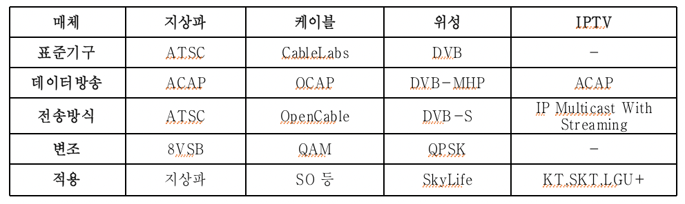 케이블 방송은 북미 CableLabs가 케이블방송 수신기 소매 시장을 열기 위해 보안 모듈을 분리하는 것을 골자로 하는 북미 디지털 케이블방송 환경 및 수신기 규격을 표준화한 것이 OpenCable이며, OpenCable 규격 위에 데이터방송 서비스가 가능하도록 만든 것이 OCAP(OpenCable Application Platform)이다. 미국의 디지털 케이블방송 표준인 Opencable 표준과 데이터방송을 위한 미들웨어 표준인 OCAP(Opencable Application Platform)을 적용하여 세계 최초로 국내에서 상용화하였으며, 가입자가 양방향이 가능한 데이터방송 부가서비스를 미국보다 2년 이상 앞선 2007년부터 상용화하였다. IPTV는 지상파 재전송을 위해 ACAP을 채택하였다.