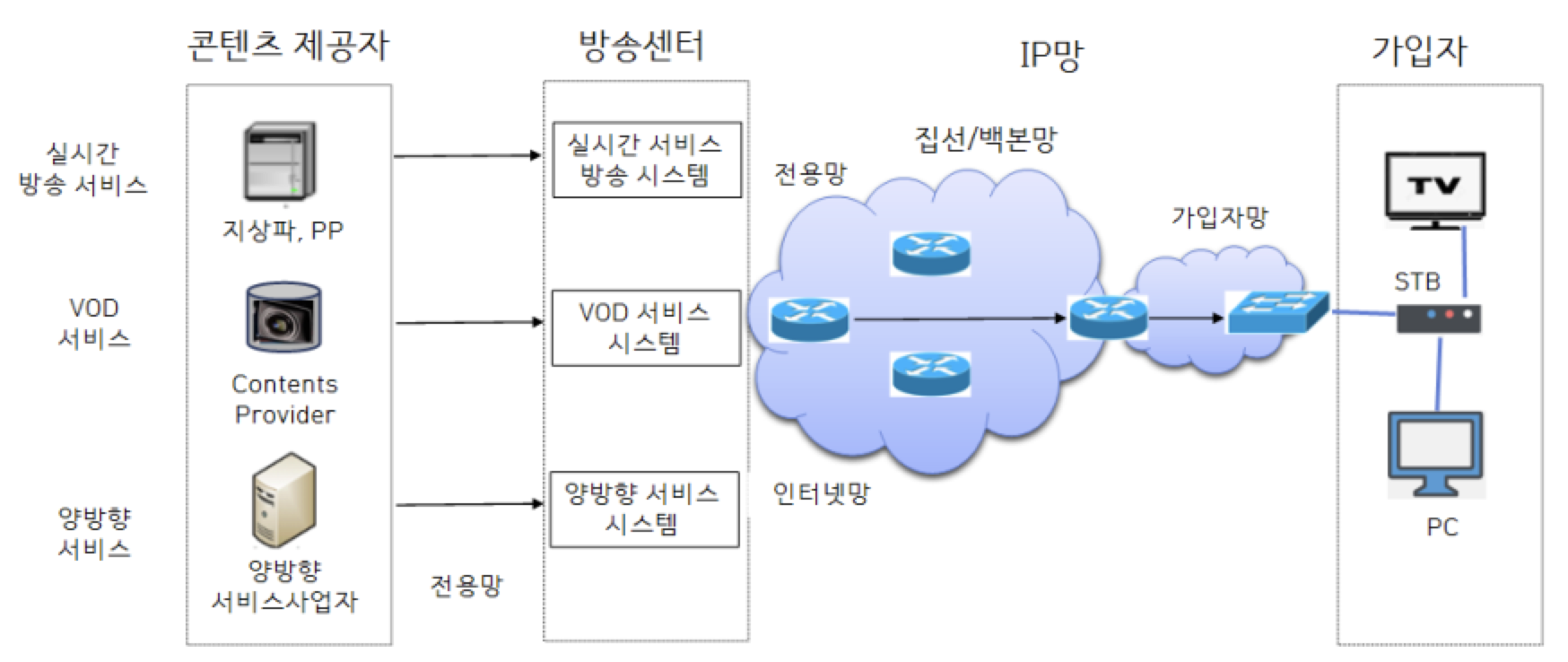 기술 특성 | - 전국적 인터넷망 - 양방향성 네트워크 - IP 멀티캐스팅 방식 (특정 이용자에게 특정 채널만 패킷형태로 전송) |