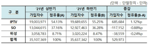 2021년 하반기 기준, 국내 유료방송 가입자는 상반기와 증가폭은 비슷하고 IPTV는 늘고 SO가 급감하였으며, KT 계열 가입자가 ‘최다’이다.