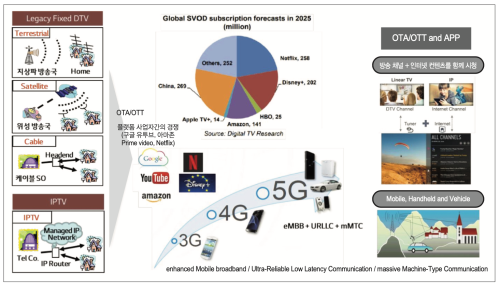 이와 같은 디지털 방송미디어 서비스의 트렌드 변화는 기존의 고정형 TV를 대상으로 하는 지상파, 케이블, 위성 방송사에게는 이미 위기가 되었고, 이미 1천6백만 가입자를 확보한 IPTV 사업자 입장에서도 5G 서비스에 대한 경쟁과 망 구축에 따르는 차별화된 사용자 서비스 발굴이 숙제로 대두되고 있다. 거기에 합세하여 영화와 스포츠, 동영상 컨텐츠의 경쟁력을 바탕으로 영역을 넓혀가는 SVOD 업체들은이미 TV뿐만 아니라, 모바일 비디오서비스와 라이브 방송영역까지 그 서비스를 확대 경쟁해가고 있다. [그림 2]는 Digital TV Research의 global SVOD 업체와 가입자의 2025년 예상을 포함하여 기존의 지상파, 케이블, 위성 방송사업자의 경계가 무너지면서 IPTV 통신사업자들이 OTT와 OTA로 서로 경쟁과 보완을 해나가는 그림을 보여 주고 있다.