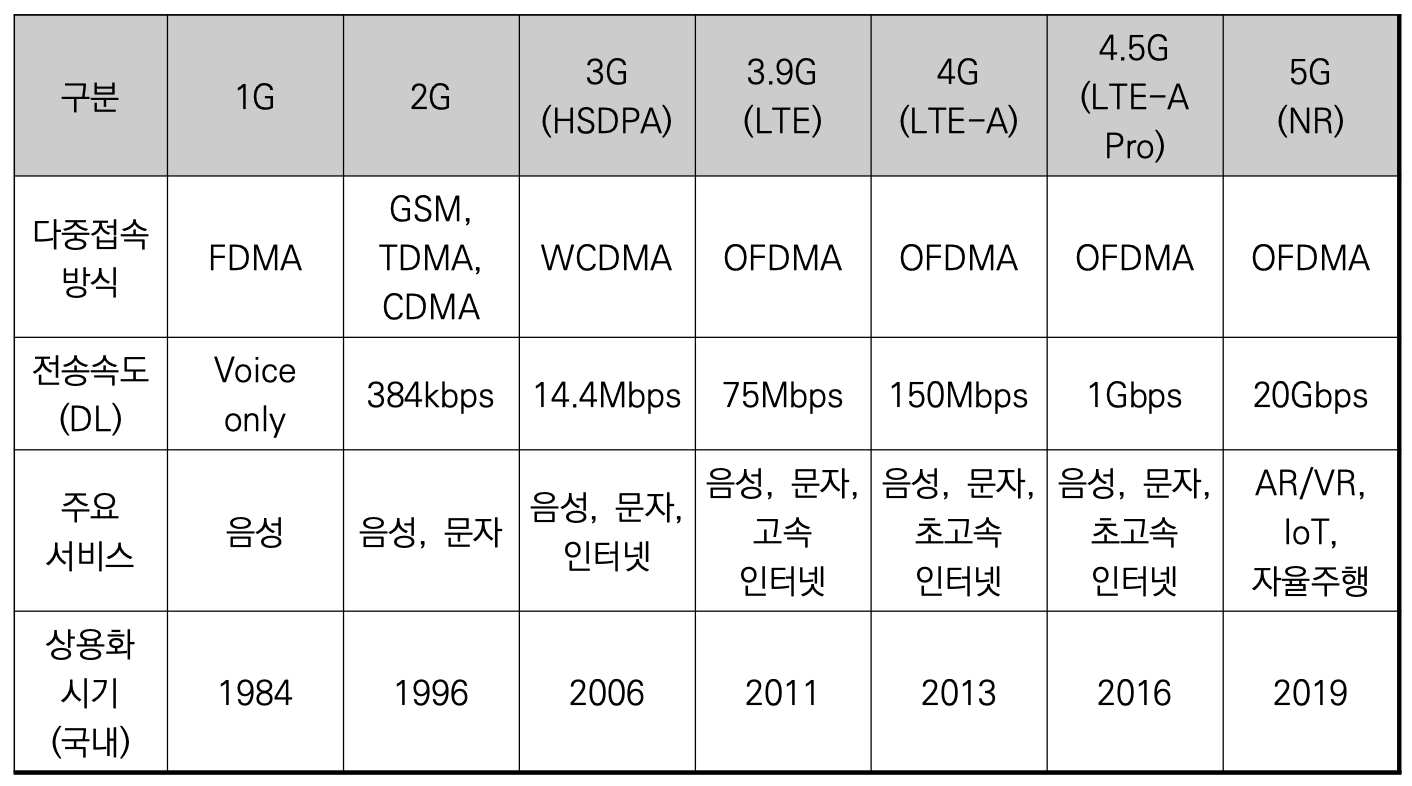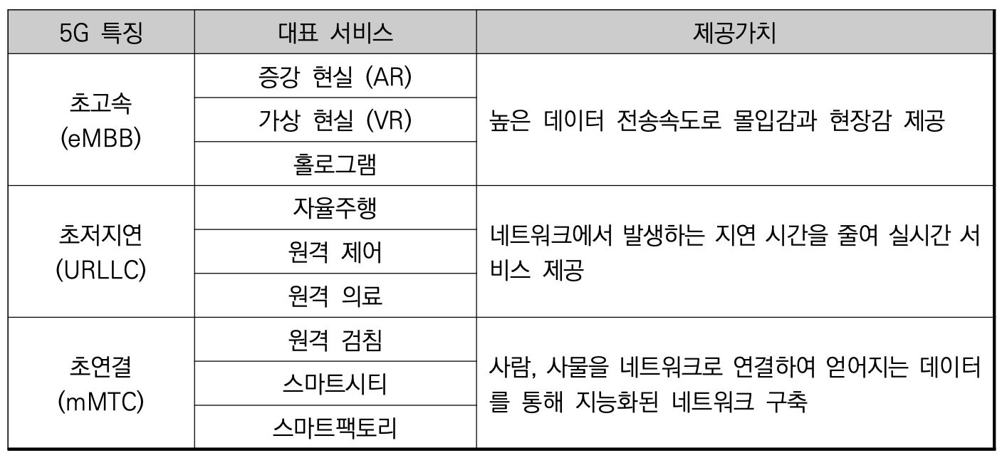 5G는 기존 LTE에서 진화된 기술을 활용해서 전송속도의 지속적인 증대뿐만 아니라, 가상현실(VR)/증강현실(AR) 등 다양한 응용 서비스를 제공하기 위한 초고속 무선 데이터 서비스(enhanced Mobile Broadband: eMBB), 자율주행차, 원격 제어 등의 저지연과 엄격한 신뢰성이 요구되는 초저지연 서비스(Ultra-Reliable and Low Latency Communication: URLLC), 그리고 스마트팩토리 등에서의 수많은 단말 연결을 위한 초연결 통신(massive Machine Type Communication: mMTC) 제공을 목표로 다양한 산업 분야에서 새로운 비즈니스 환경을 만들고 혁신적인 변화를 이끌 것으로 기대되고 있다. 아래 [표2]는 세대별 이동통신에 대한 비교를 나타내고, [표3]은 5G 특징, 대표 서비스 및 제공 가치를 나타낸다.